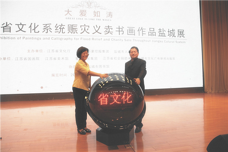 由江蘇省文化廳、江蘇省蘇豪控股集團、鹽城市人民政府共同主辦,江蘇省國畫院、江蘇省美術館、愛濤文化集團、江蘇省社會捐助中心、鹽城市文化廣電新聞出版局共同承辦的“大愛如濤——江蘇省文化系統賑災義賣書畫作品鹽城展”,于9月21日在鹽城市圖書館正式開幕,為期一周。