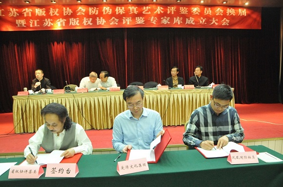 會(huì)上,愛(ài)濤文化集團(tuán)同江蘇省版權(quán)協(xié)會(huì)防偽保真藝術(shù)評(píng)鑒委員會(huì)、江蘇鳳凰國(guó)際拍賣公司簽訂戰(zhàn)略合作協(xié)議,三方共同攜手引領(lǐng)誠(chéng)信消費(fèi)新風(fēng)尚,為江蘇省藝術(shù)品市場(chǎng)保駕護(hù)航。