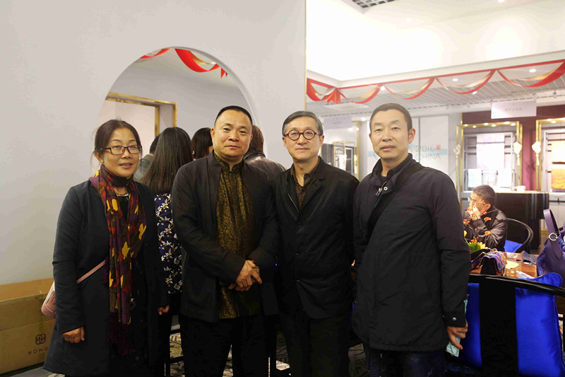 鼎盛絲綢董事長(zhǎng)吳建華與江蘇省工藝美術(shù)大師、弄影時(shí)裝藝術(shù)顧問(wèn)顧鳴、華藝品牌工廠直營(yíng)中心總經(jīng)理徐清、蘇豪傳媒副總經(jīng)理單鳳艷合影。